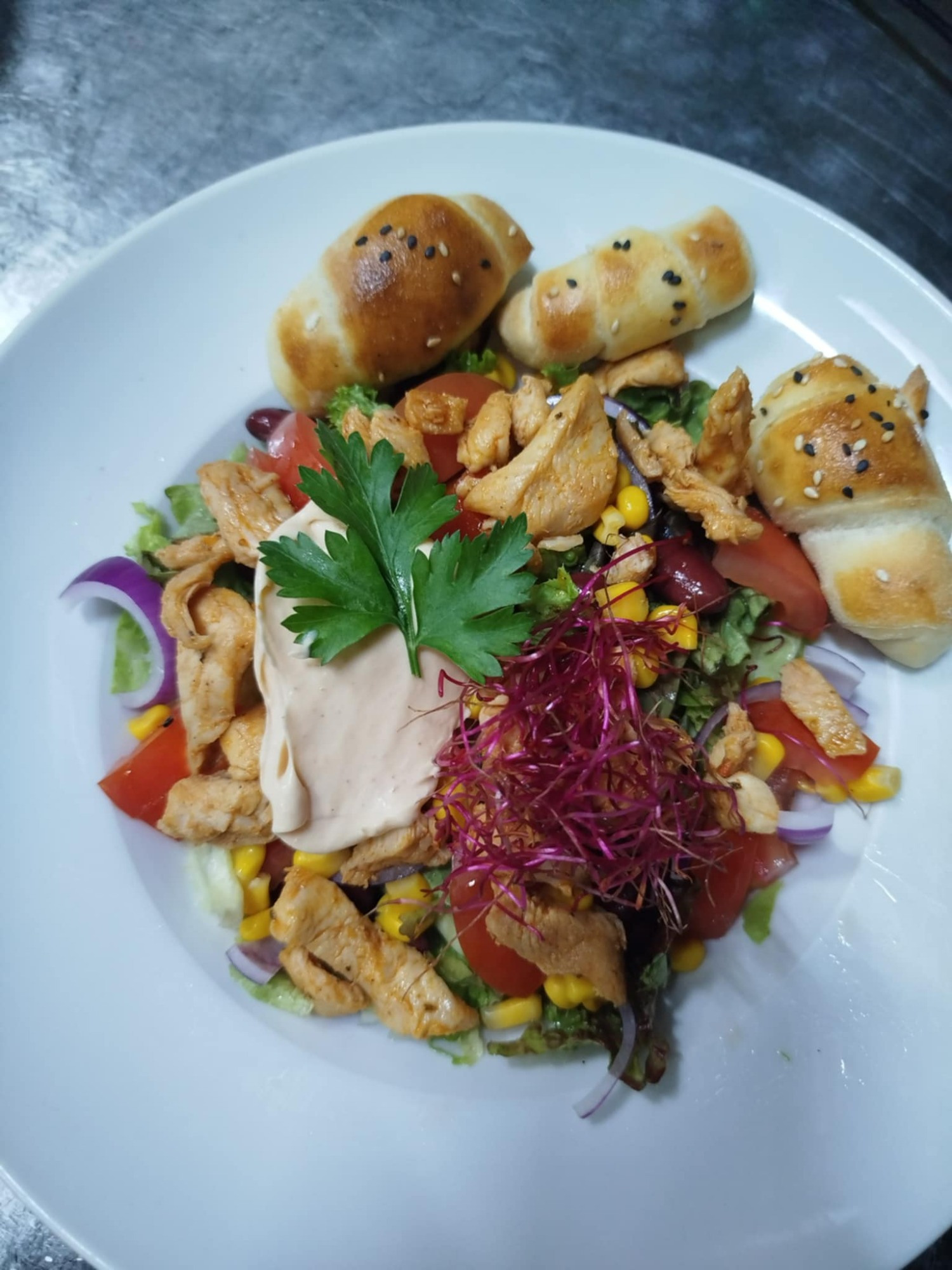 mix šalátov, kuracie rezančeky, paradajky, fazuľa, kukurica, červená cibuľa, majonézový dressing, pečivo /1,3,7/ -