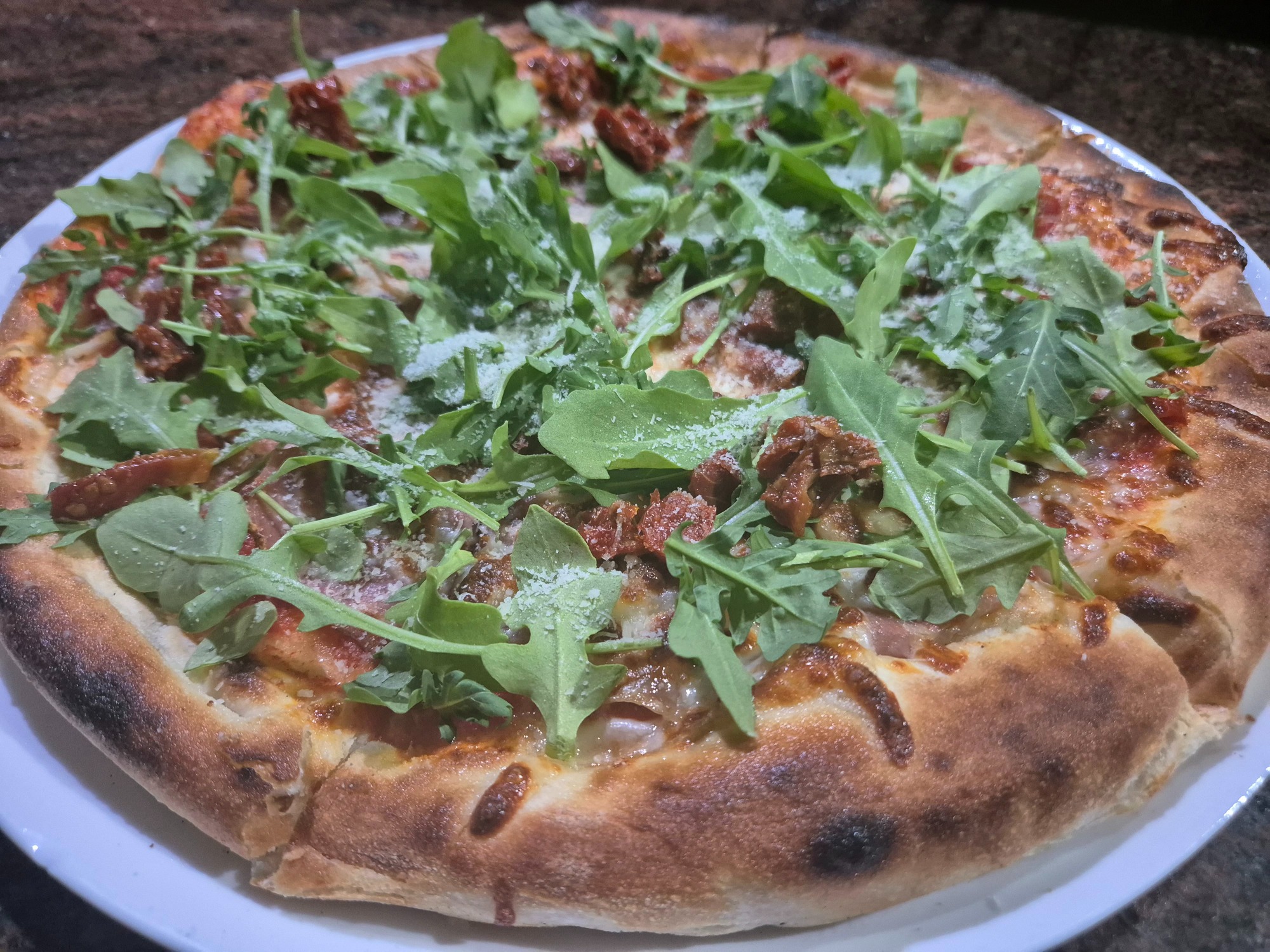 paradajková omáčka, syr, prosciutto, rukola, sušené paradajky, parmezán
